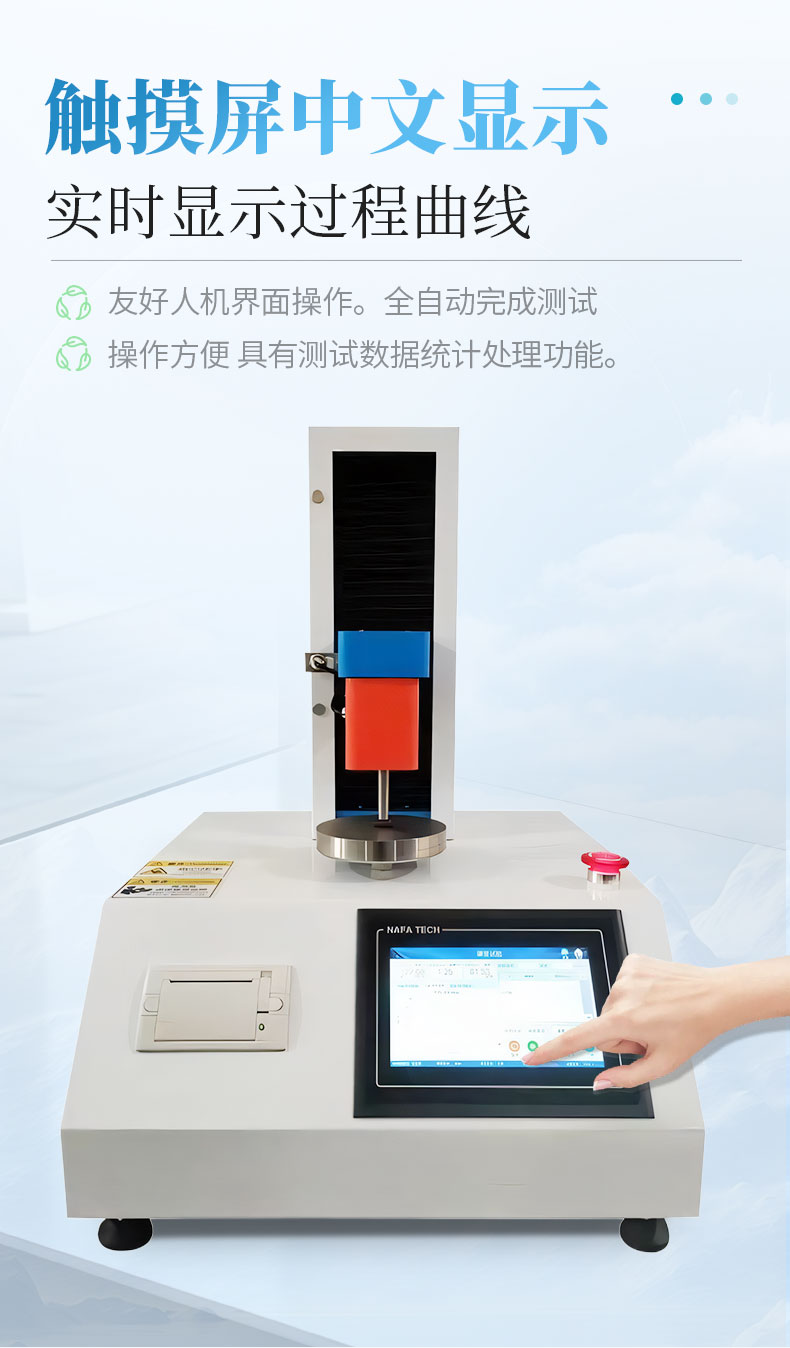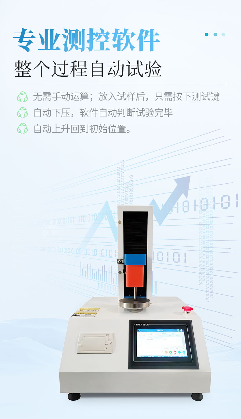 7、软件:专业测控软件,整个过程自动试验,无需手动运算;放入试样后,只需按下测试键,自动下压,软件自动判断试验完毕,自动上升回到初始位置。