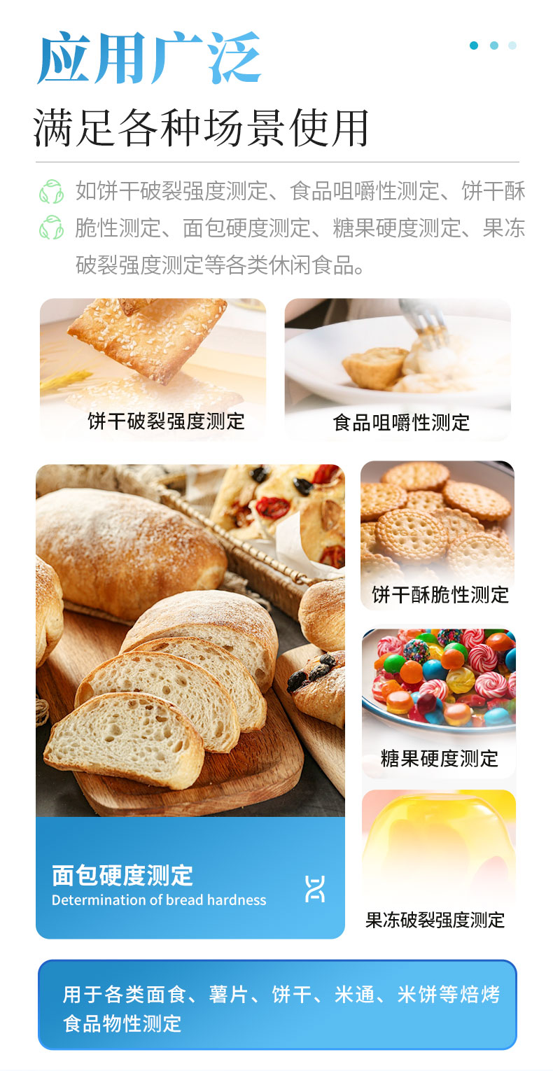 食品硬度仪适用于各类面食、薯片、饼干、米通、米饼等焙烤食品物性测定,如饼干破裂强度测定、食品咀嚼性测定、饼干酥脆性测定、面包硬度测定、糖果硬度测定、果冻破裂强度测定等各类休闲食品。