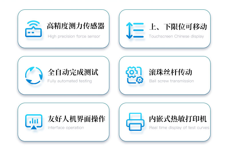 3、大触摸屏中文显示(可中英文切换),友好人机界面操作。全自动完成测试。操作方便,具有测试数据统计处理功能。