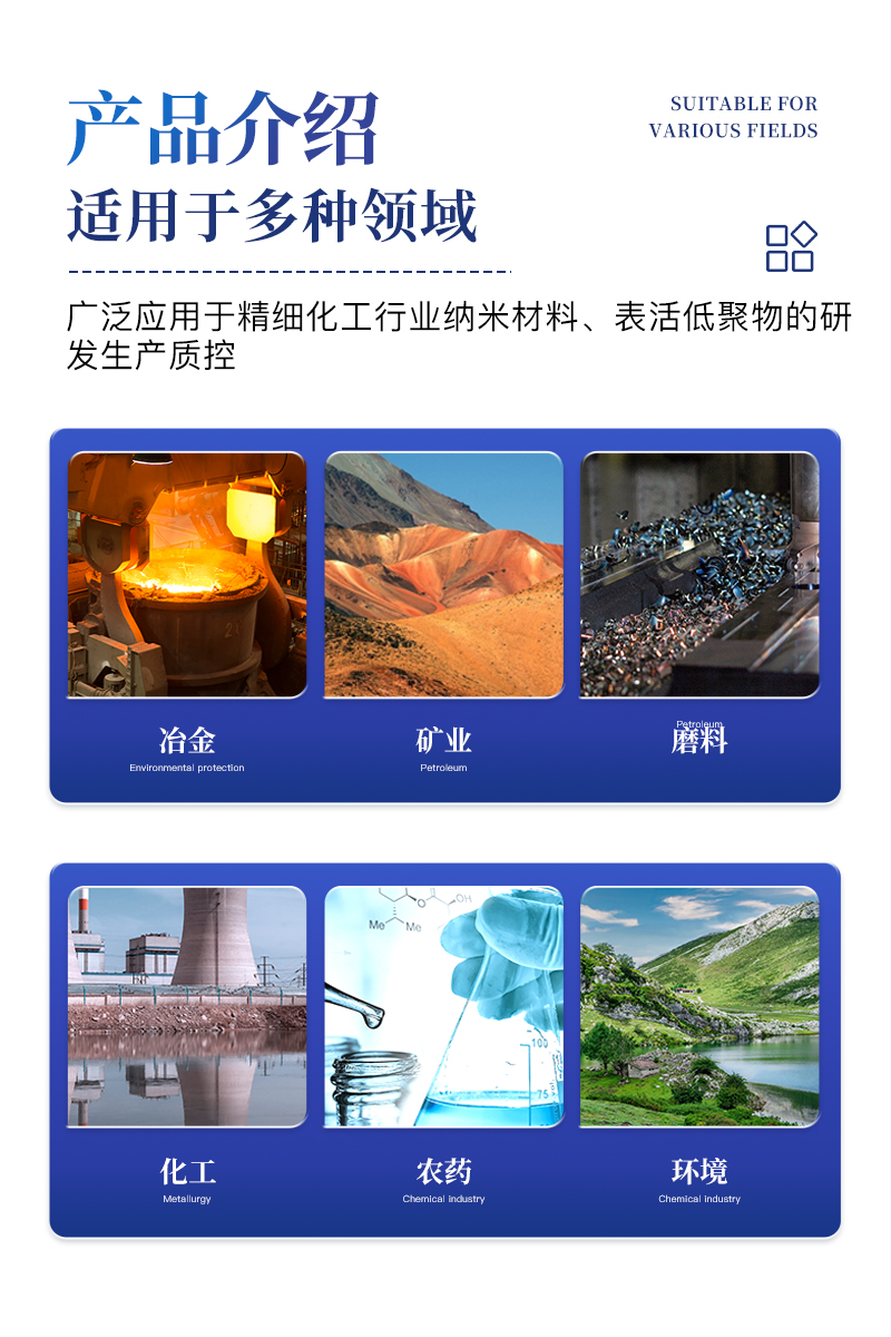 激光粒度分析仪同时具有Zeta电位及纳米粒径的分析测试功能,适用于多种不同的纳米乳液、悬浮液胶体等的粒度和表面电位测量,能广泛应用于精细化工行业纳米材料、表活、低聚物等的研发和生产质控,同时也是油墨,医药制剂等行业产品研发及质控检测仪器。