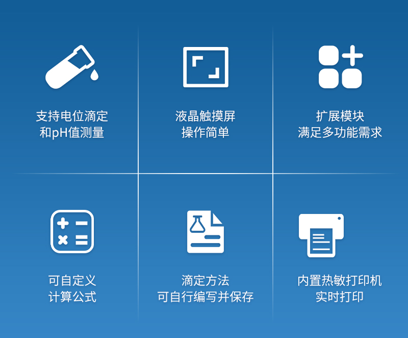 1、设备支持电位滴定和pH值测量;用户选择不同电极可进行酸碱滴定、氧化还原滴定、沉淀滴定、络合滴定等多种滴定和pH测量;